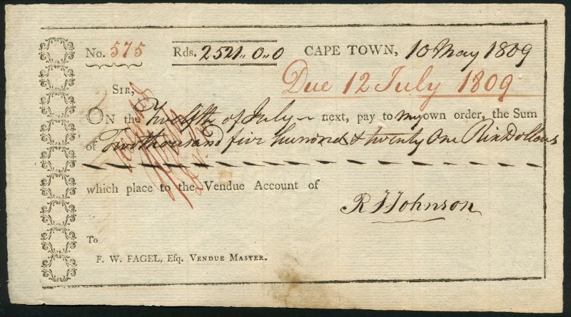 Cape Town, a payment order dated 10 May 1809, black text on parchment like paper, also De Paarlsche Bank, payment order dated 11 November 1863, black text on cream paper, and a payment order on the Savings Bank, Cape Town, dated 20 September 1831, black text on parchment like paper, also a sight bill dated 28 September 1863 drawn on the Grahamstown Savings Bank, black text on blue paper, all are hand entered and signed