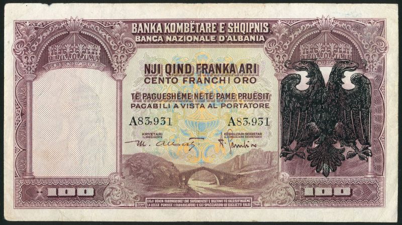 Banca Nazionale D'Albania, Italian Occupation (1939-1942), 100 franka ari, ND (1939), serial number A 83931, purple and multicoloured, bridge low centre, black double headed eagle handstamp at right, reverse green and purple, coutryside view at centre, value at left and right