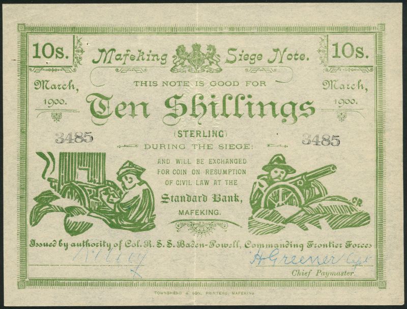 Mafeking Siege note, 10 shillings, March 1900, serial number 3485, green on white paper, field gun and defender at left and right, signatures of Urry and Greener below, 'Commanding' in text