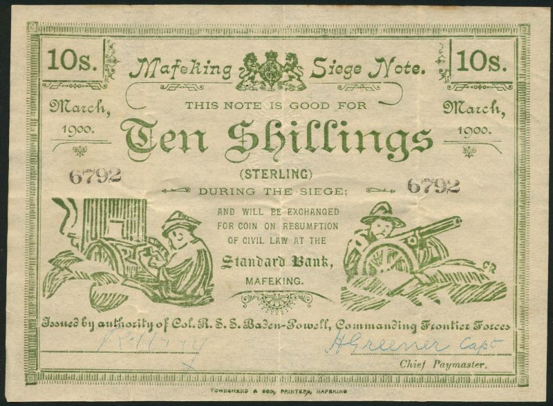 Siege of Mafeking, South Africa, 10 shillings (2), March 1900, serial numbers 6791 and 6792, green text on white paper, field gun at left and right, value in green at right, arms top centre, handstamped signature of Greener low right, Urry low left