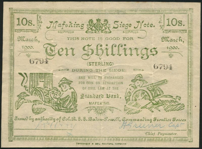 Siege of Mafeking, South Africa, 10 shillings (2), March 1900, serial numbers 6793 and 6794, green text on white paper, field gun at left and right, value in green at right, arms top centre, handstamped signature of Greener low right, Urry low left