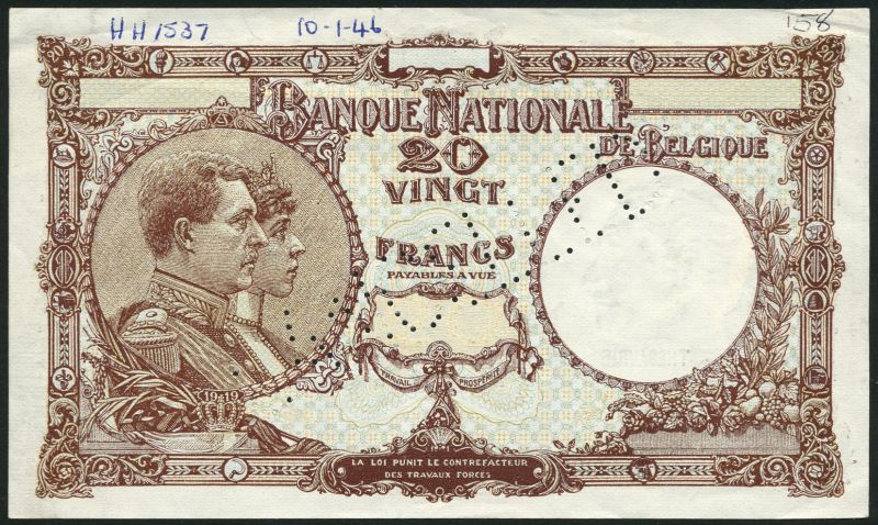 (†) Banque Nationale de Belgique, specimen 20 Francs, ND (ca 1946), no serial numbers, brown on light blue and brown underprint, King Albert and Queen Elisabeth in profile at left, without overprint TRESORIE in circle at right, reverse Grand Place, Brussels, with THESAURIE in circle at left, perforated CANCELLED