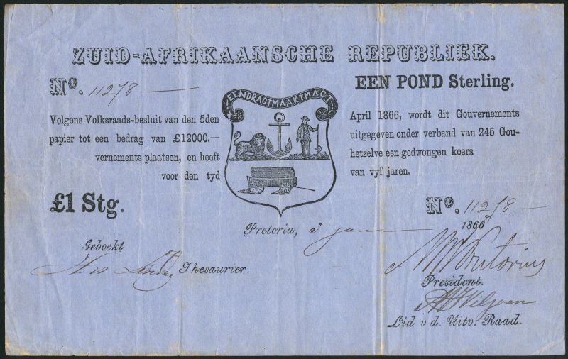 South African Republic Government issues, 1 pond sterling of the second issue, 3 January 1866, serial number 11278, black text on blue paper, arms at centre, value in bold black type at left and right, manuscript date and serial numbers and three signatures in lower field