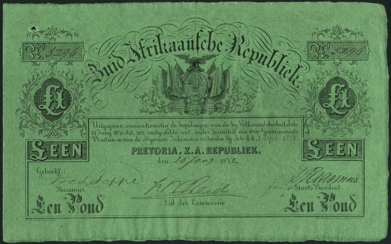 South African Republic Government issues, 1 pond sterling, 25 January 1872, serial number 5296, black text on green paper, arms at centre, value at left and right, manuscript date and serial numbers and three signatures in lower field
