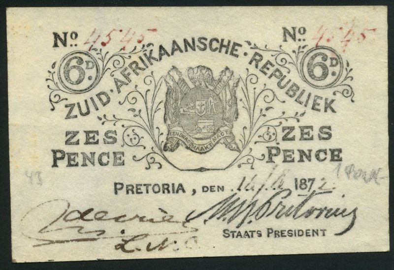 South African Republic Government issues, six pence (zes pence), 16 April 1872, red ink serial number 4545, black text on cream vellum, arms at centre, value in circular frame top left and right, manuscript date and serial numbers and manuscript signatures below, the right hand signature Pretorius