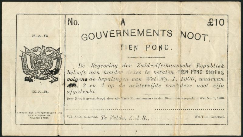 Governements Noot, unissued £10/tien pond, Te Velde Z.A.R. issue, ND (ca 1902), black text on white paper, arms at left