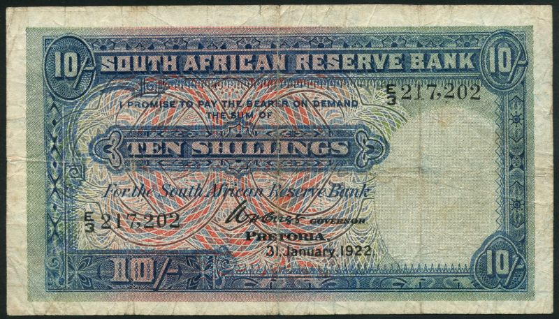 South African Reserve Bank, 10 shillings, Pretoria, 31 January 1922, black serial number E/3 217202, blue and red, Clegg signature, value at left and at each corner, reverse purple, pale orange and yellow