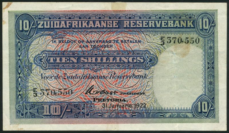 Zuidafrikanse Reservebank, 10 shillings, Pretoria, 31 January 1922, black serial number E/3 370550, blue and red, Clegg signature, value at left and at each corner, text in Dutch, reverse purple, pale orange and yellow