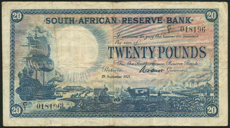 South African Reserve Bank, £20, 29 September 1921, serial number C/1 018196, blue and pale pink, galleon at left, allegorical scenes of South Africa in field, Clegg signature, value right centre and at each corner, English text, reverse blue and pale pink and yellow, design as obverse but Dutch text