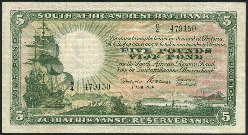 South African Reserve Bank, £5, 7 April 1926, serial number B/4 479150, green and pale pink-red, galleon at left, allegorical scenes of South Africa in field, Clegg signature, value right centre and at each corner, reverse green and pale pink and yellow, portrait of Van Riebeeck in circular frame top left, value at centre and at each corner