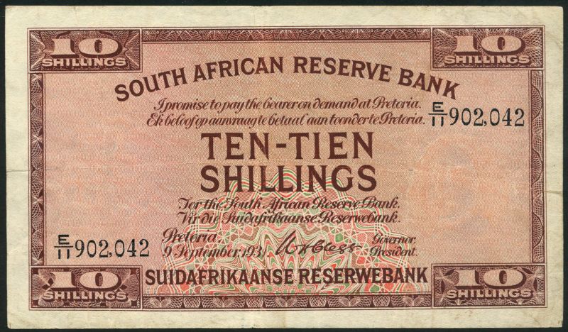 South African Reserve Bank, 10 shillings, 9 September 1931, serial number E/11 902042, pink-brown, value at centre and at each corner, Clegg signature, reverse pink-brown, arms and value at centre