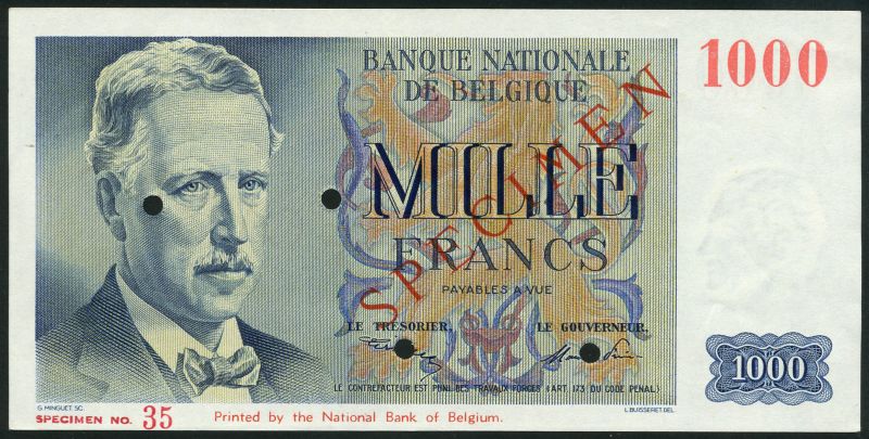 (†) Banque Nationale de Belgique, specimen 1000 Francs, ND (1950-58), no serial numbers, blue and multicoloured, King Albert I at left, heraldic lion at centre, reverse Hendrik Geeraert at left centre, lock and Yser Canal at right, overprinted SPECIMEN in red on obverse and reverse, four punch holes
