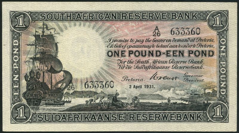 South African Reserve Bank, £1, 2 April 1931, serial number A/26 633360, black and pale pink and orange, galleon at left, allegorical South African scenes in field, Clegg signture, reverse brown, pink and pale orange, arms and value at centre