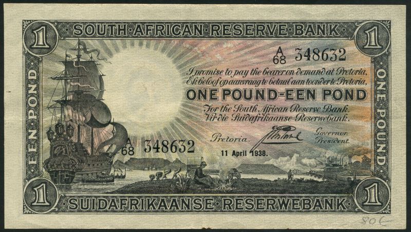 South African Reserve Bank, £1, 11 April 1938, serial number A/68 348632, black and pale pink and orange, galleon at left, allegorical South African scenes in field, Postumus signture, reverse brown, pink and pale orange, arms and value at centre
