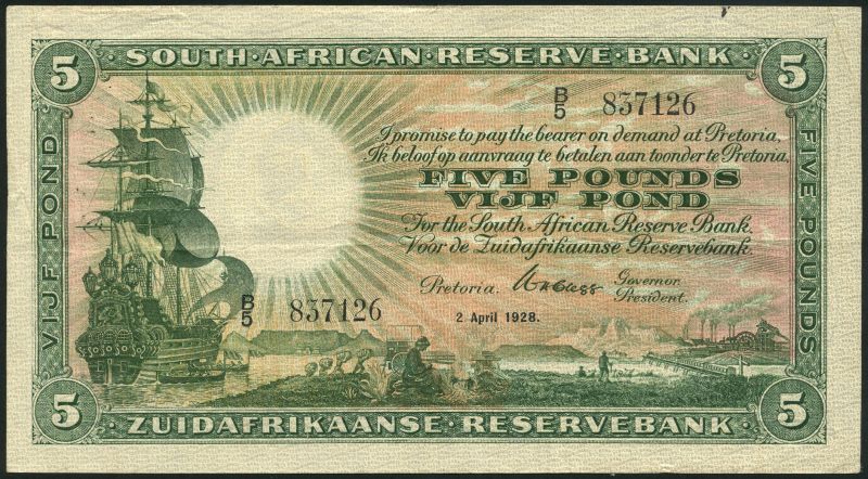South African Reserve Bank, £5, 2 April 1928, serial number B/5 837126, green and pale pink and orange, galleon at left, allegorical South African scenes in field, Clegg signature, reverse green, pink and pale orange, arms and value at centre