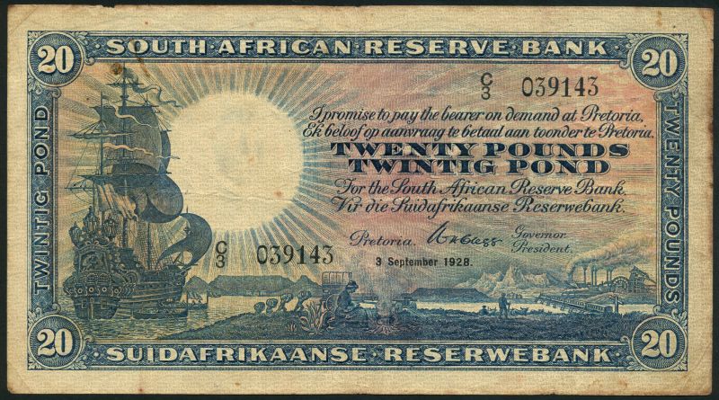 South African Reserve Bank, £20, 3 September 1928, serial number C/3 039143, blue and pale pink, galleon at left, allegorical scenes of South Africa in field, Clegg signature, value right centre and at each corner, reverse blue and pale pink and yellow, arms and value at centre