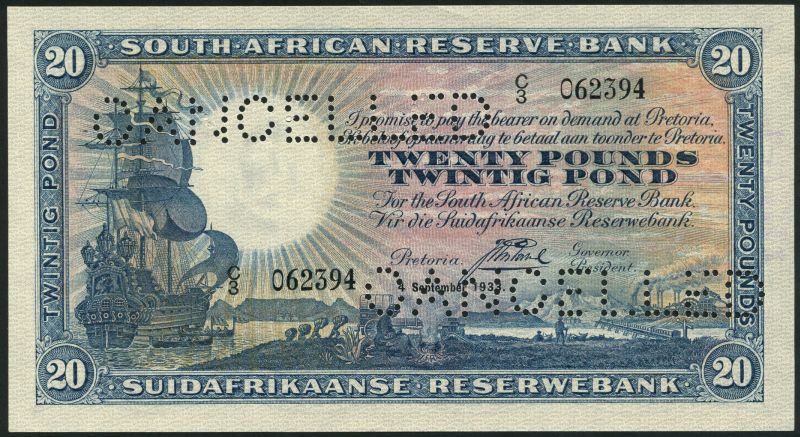 South African Reserve Bank, £20, 4 September 1933, serial number C/3 062394, blue and pale pink, galleon at left, allegorical scenes of South Africa in field, Postumus signature, value right centre and at each corner, reverse blue and pale pink and yellow, arms and value at centre