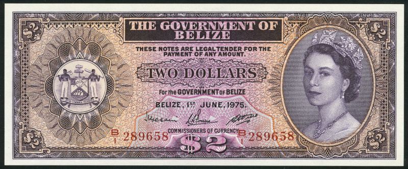 (x) Government of Belize, 1 Dollar, 1 June 1975, serial number A/1 401728, green on multicoloured underprint; 2 Dollars, 1 June 1975, serial number B/1 289658, violet on multicoloured underprint, both Queen Elizabeth II at right, arms at left, reverse ornate guilloches (Pick 33b, 34b). BRITISH CARIBBEAN TERRITORIES. The British Caribbean Territories, Eastern Group, 1 Dollar, 2 January 1957, serial number V2-024655, Queen Elizabeth II at right, map at lower left, reverse arms