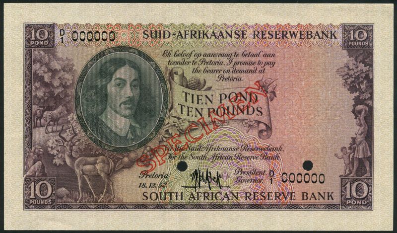 South African Reserve Bank, specimen £10, 18 December 1952, serial number D/1 000000, purple and multicoloured, Van Riebeeck at left, allegorical scenes of South African wildlife in field, woman and child at right de Kock signature, value at centre and at each corner, first line of text in Afrikaans, reverse purple, mining scene
