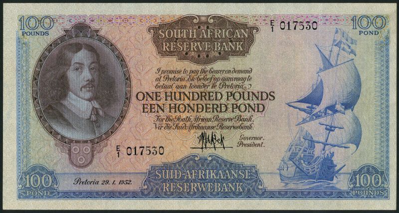 South African Reserve Bank, £100, 29 January 1952, serial number E/1 017530, blue and multicoloured, Van Riebeeck in oval frame top left, galleon in full sail at right, first line of text in English, de Kock signature, reverse blue and multicoloured, arms at centre, value low left and right