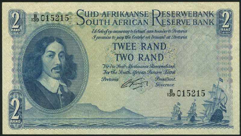 South African Reserve Bank, 2 rand (3), ND (1962-), serial number prefixes B/104,B/139,B/237, blue and pale orange, Van Riebeck at left, Rissik signature, B/104 first line of text in English, B/139 and B/237 in Afrikaans