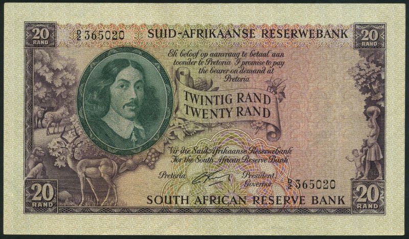 South African Reserve Bank, 20 rand, ND (1962), serial number D/2 365020, purple and multicoloured, Van Riebeck at left in dark green oval frame, allegorical scenes of South African wildlife at left, woman and child at right, Rissik signature, first line of text in Afrikaans, reverse purple, mining scene