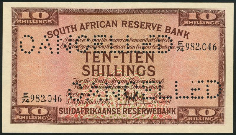 South African Reserve Bank, specimen 10 shillings, 5 September 1945, serial number E/74 982,046, brown on multicolour underprint, value at centre and each corner, reverse arms