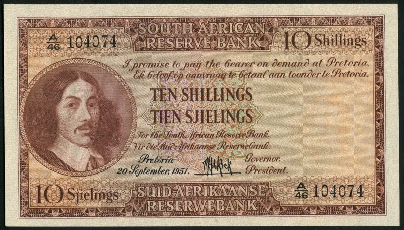South African Reserve Bank, 10 shillings (2), 10 April 1948, serial numbers A/1 0455449-50, Afrikaans above English text, also 10 shillings (2), 20 September 1951, serial numbers A/46 104072 and 74, English above Afrikaans text, all brown on multicolour underprint, van Riebeeck at left