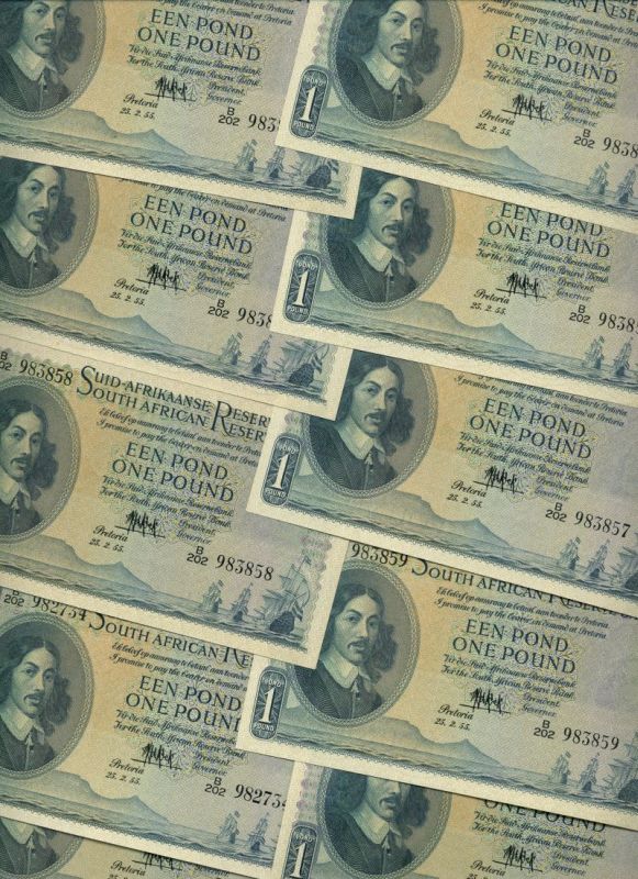 South African Reserve Bank, 1 pound (13), 1955 to 1959, several serial number runs, Afrikaans text above English, dark blue on multicolour underprint, van Riebeeck at left