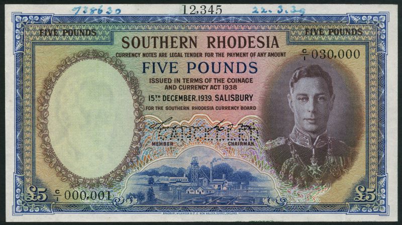 (†) Southern Rhodesia Currency Board, specimen £5, 15 December 1939, serial number C/1 000001-C/1 030000, blue and multicoloured, George VI at right, mining scene at low centre, Fox signature, reverse blue and orange, Victoria Falls at centre, arms above, Sable Antelope at left, value at centre and at each corner