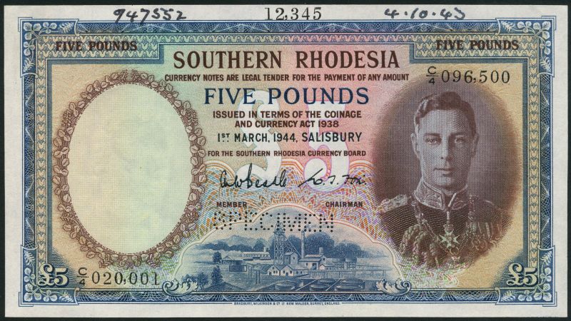 (†) Southern Rhodesia Currency Board, specimen £5, 1 March 1944, serial number C/4 020001-C/4 096500, blue and multicoloured, George VI at right, mining scene at low centre, Fox signature, value in white underprint at centre, reverse blue and orange, Victoria Falls at centre, arms above, Sable Antelope at left, value at centre and at each corner