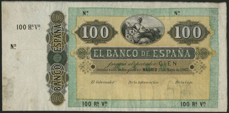 (†) El Banco de Espana, specimen 100 reales, Madrid, 1 May 1862, black, brown, pale orange and green, maiden (Spain) top centre with arms and lion in oval frame, value top left and right, counterfoil at left, reverse value inverted in brown panel