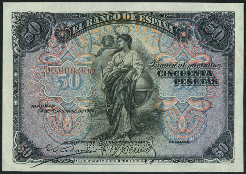 (†) El Banco de Espana, specimen 25 and 50 pesetas, 24 September 1906, allegorical figures, also specimen 25 pesetas, De la Barca at right and 50 pesetas, Velazquez at right, both 15 August 1928