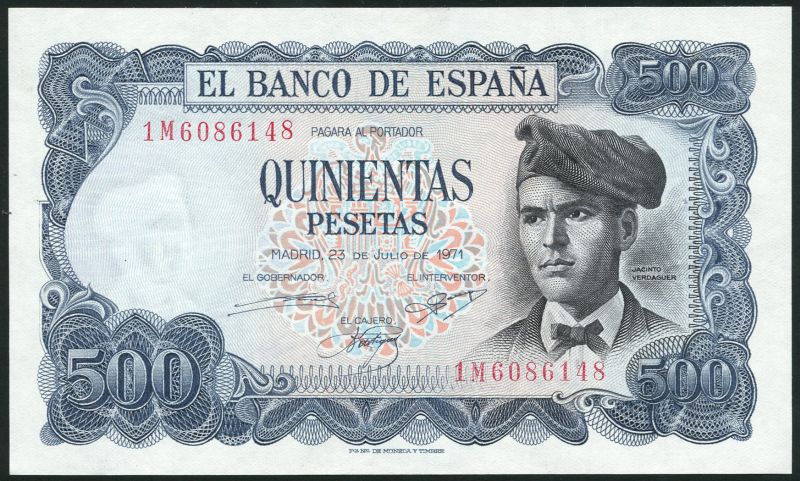 El Banco de Espana, 500 pesetas, 23 July 1971, red serial number 1M 6086148, blue and pale pink, Verdaguer at right