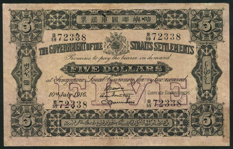 Government of the Straits Settlements, $5, 10 July 1916, serial number B/59 72338, black, arms at top centre, value at centre and each corner, reverse tiger at centre