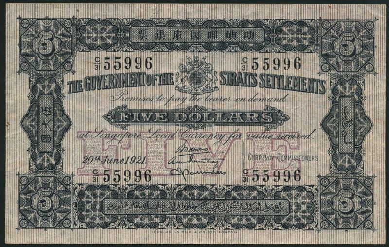 Government of the Straits Settlements, $5, 20 June 1921, serial number C/31 55996, dark grey and pale grey, value in violet underprint low centre, arms top centre, value at each corner, three printed signatures low right, reverse dark grey, value in violet underprint top centre, tiger at centre, kris at each corner