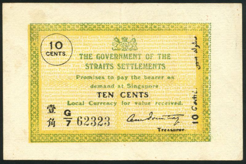 (x) Government of the Straits Settlements, 10 cents, 5 February 1920, serial number G/7 62323, green and pale yellow, arms top centre, signature of Pountney, the Treasurer low right, reverse red and white