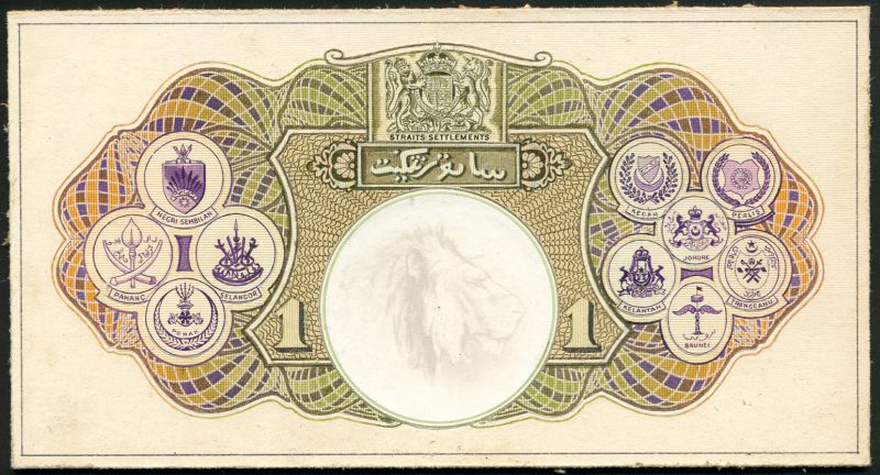 (†) Government of the Straits Settlements, a composite essay on board for a proposed reverse issue, ND (ca 1931), green and multicoloured, arms top centre, sketch of a lion at centre, four arms at left and six arms at right of the states of the Straits Settlements