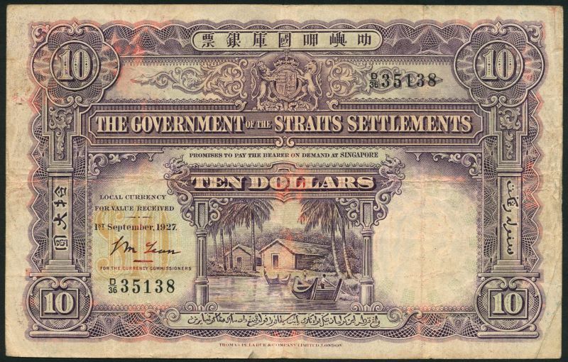 Government of the Straits Settlements, $10, 1 September 1927, serial number D/36 35138, purple and multicoloured, huts, palm trees, river and boats low centre, arms top centre, value in bronze at left, value at each corner, printed signature of Lean low right, reverse purple, bullock cart at centre, value at left and right