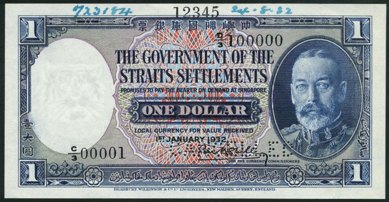 (†) The Government of the Straits Settlements, printer's archival specimen 1 Dollar, 1 January 1932, serial number run C/3 00001 to D/3 1,00000, dark blue on multicoloured underprint, King George V at right, reverse woman in profile at left, tiger at centre, perforated CANCELLED