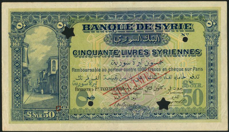 (x) Banque de Syrie, specimen 50 livres, Beyrouth, 1 January 1920, green, pale yellow, orange and lilac, Syria street in Beirut at left, value in field, Berard and Stobert signatures, reverse purple and multicoloured, feluccas and mountains at centre, value at left and right