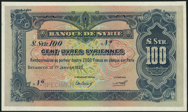 (x) Banque de Syrie, specimen 100 livres, 1 January 1920, blue, pink, green and yellow, Berard signature low left value at right and in field, reverse blue, green and red, bank title at centre, value at each corner