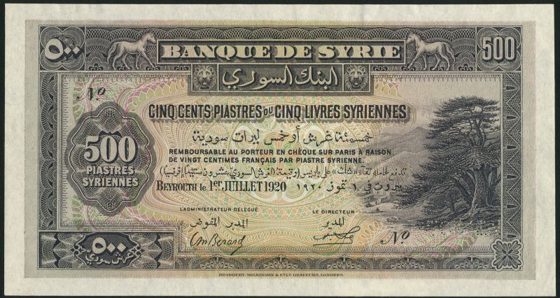 (x) Banque de Syrie, obverse and reverse uniface proofs of 500 piastres, 1 July 1920, dark brown on multicolour underprint, Cedar of Lebanon at right, horses at top left and right, reverse black on multicolour, coastal scene at centre