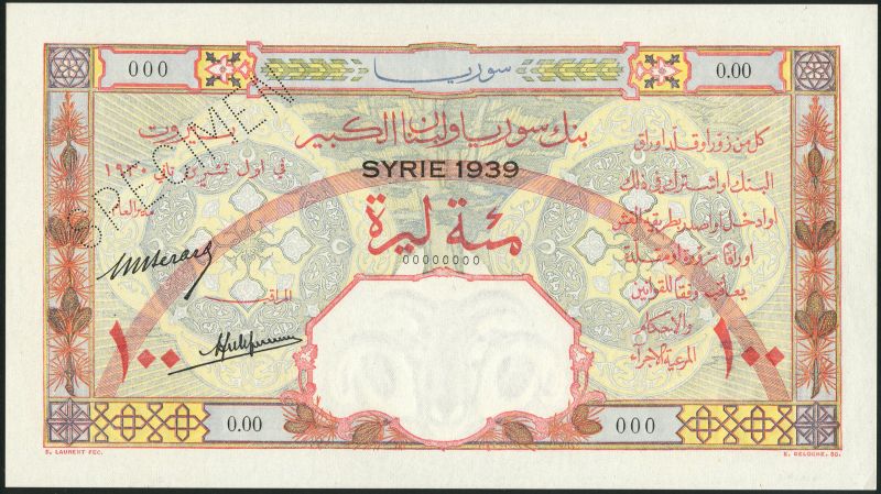 Banque de Syrie et du Grand-Liban, specimen 100 livres, 1930 (1939), zero serial numbers, red, pale blue and multicoloured, cedar tree at centre, ornate background detail, pine cones at left and right, Berard and Laferriere signatures, black SYRIE 1939 top centre and red arc in field, reverse red, mauve and multicoloured, incense burner at left and right, red arc in field, view of Mosque top centre, blue SYRIE top centre