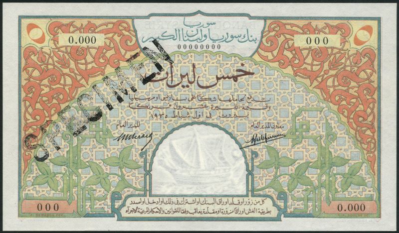 (x) Banque de Syrie et du Grand-Liban, colour trial 5 livres, serial number 0.000 000, red, blue, green and multicoloured, ornate design, reverse multicoloured, buildings at centre, value at top left and right