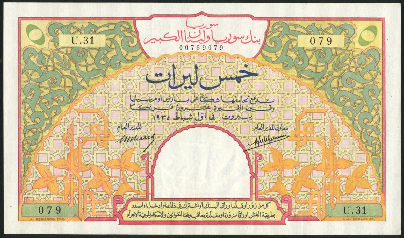 (x) Banque de Syrie et du Grand-Liban, 5 livres, 1 February 1935, serial number U.31-079 00769079, orange, pink, green and multicoloured, ornate design, reverse multicoloured, buildings at centre, value at top left and right