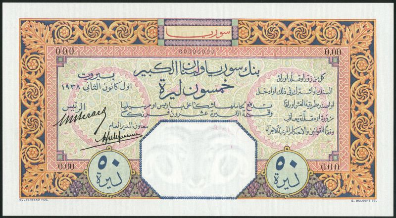 (x) Banque de Syrie et du Grand-Liban, specimen 50 livres, 1 January 1938, zero serial numbers, blue, gold and multicoloured, value at low left and right, ornate border and design, reverse red, gold, green and multicolour, buildings at centre, value at each corner