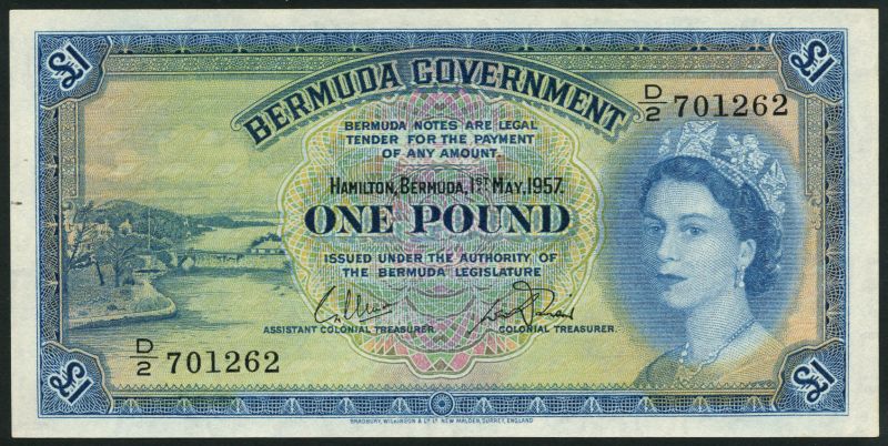 (x) Bermuda Government issue, £1 (3), 1 May 1957, prefixes C/2,D/2,Z/1, blue and multicoloured, Elizabeth II at right, Somerset Bridge in Sandys at left, all no thread type