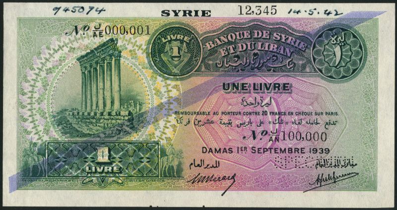 (†) Banque de Syrie et du Liban, specimen 1 livre, Damas, 1 September 1939, serial number J/AE 000001-J/AN 100000, green, lilac and multicoloured, the pillars of Baalbek at left, Berard and Laferriere signatures low right, violet diagonal across face of note, SYRIE in black in top margin, reverse red and multicoloured, view of Antioch at centre, violet diagonal across face of note