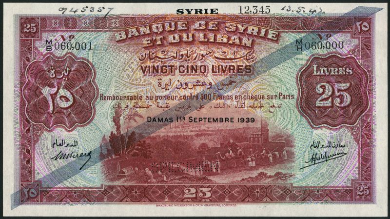 (†) Banque de Syrie et du Liban, specimen 25 livres, 1 September 1939, serial number M/B060001-M/H 060000, purple and multicoloured, camel train and cemetery at centre, value at left and right and at each corner, Berard and Laferriere signatures, SYRIE in black top centre, blue diagonal acrosss face of note, reverse green and multicoloured, well at centre, blue diagonal across face of note